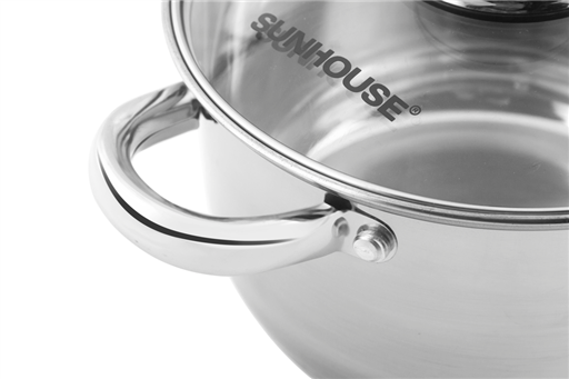 Vung kính cường lực trong suốtNồi inox 3 đáy SUNHOUSE SH22120 được trang bị vung kính cường lực, trong suốt giúp bạn dễ dàng quan sát thực phẩm bên trong nồi. Viền mép vung được bọc inox, vừa sang trọng, vừa hạn chế bể vỡ khi va đập.